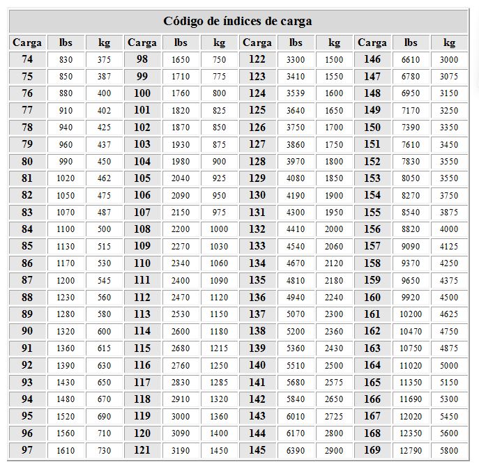 82 Indice de carga o LI (load index). Cada índice representa un peso que puede soportar a la velocidad máxima especificada y a la presión correcta. En este caso 475 Kg, lo que multiplicado por 4 da un peso vehicular máximo de 1.900 Kg. Un índice más grande indica mayor peso soportable. Los índices son: